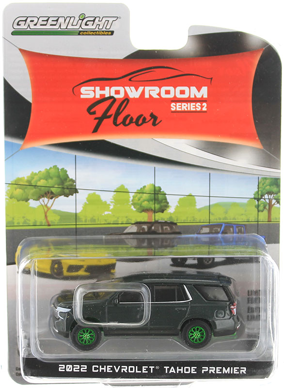 CHEVROLET Tahoe premier 2022 grau mit grünen Felgen aus der SHOWROOM FLOOR Serie in Blisterverpackung
