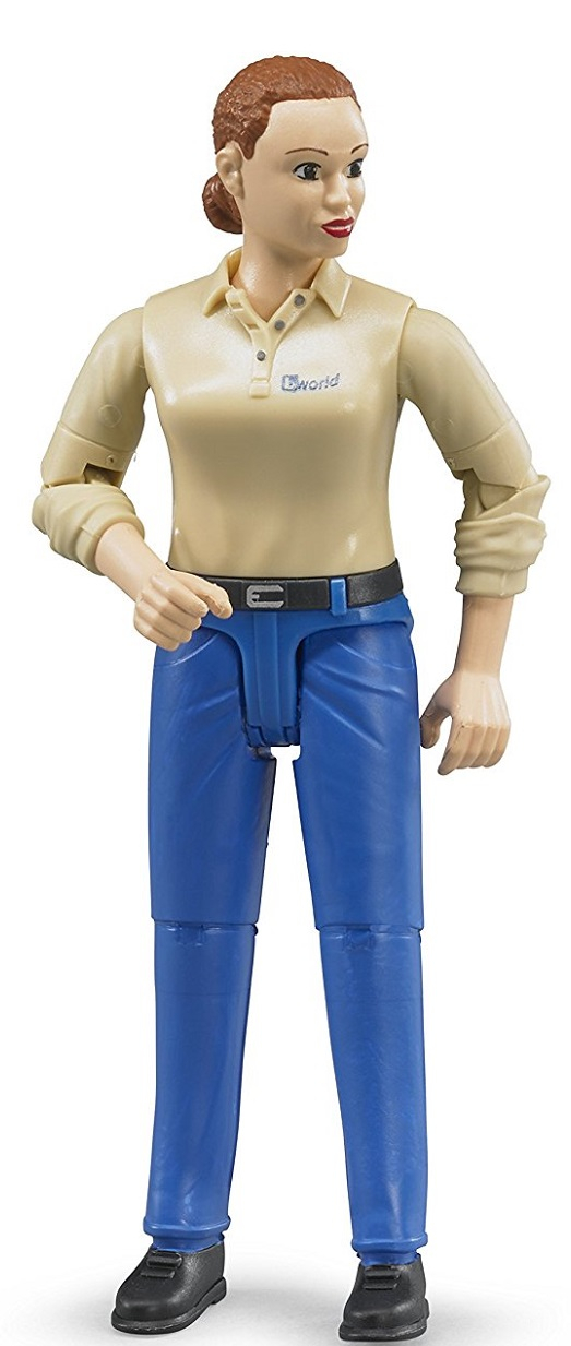 Kastanienfrau mit beigem Hemd und blauer Hose