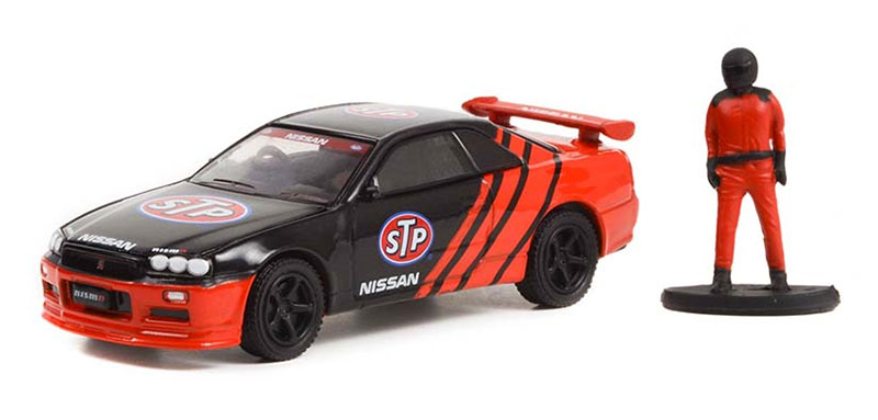 NISSAN Skyline R34 1999 mit Rennfahrer aus der THE HOBBY SHOP Serie in Blisterverpackung.