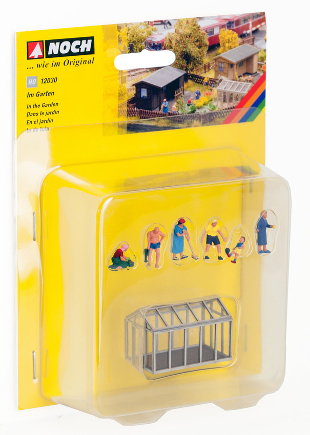 Set aus 6 Figuren mit einem Gartengewächshaus